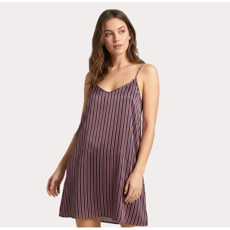 Elegantne ja šikk siidist triibuline öösärk, millel on õrnad spagetipaelad ja vabalt langev, voogav lõige.